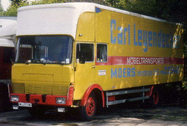 Noch bevor die niederrheinische Gegend um Moers zu meiner Wunschheimat wurde, entdeckte ich im September 1994 diesen raren Magirus-Deutz 170 D 11 F mit Ackermann Möbelwagen-Aufbau in klassischer Lackierung. |