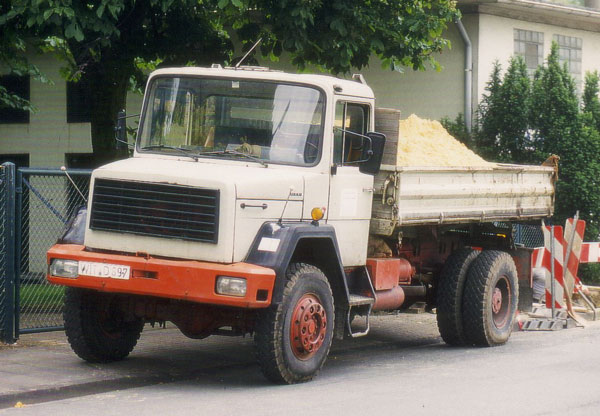 Den internen Fuhrpark der Bochumer Opel-Werke bereicherte bis zum Beginn der 90er Jahre dieser MAN 780 HAK mit eigenwilligem Kipp-Aufbau, der sich hier außehalb des Werksgeländes auf einer winterlichen Baustelle nützlich macht. |