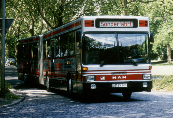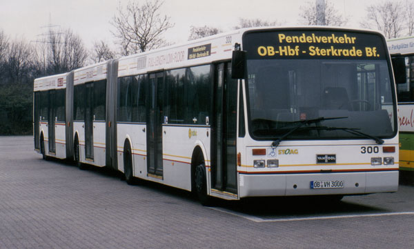Um die Praktikabilität eines Doppelgelenkbusses auf der Nahverkehrstrasse in Oberhausen zu testen, stand der Stoag im Jahre 1998 leihweise dieser Van Hool AGG 300 zur Verfügung, er bekam für den Einsatz eine Sondergenehmigung. |