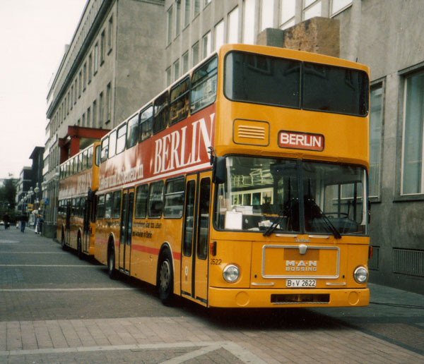 Diese zwei MAN SD 200 bzw. BVG Typ SD 74 mit Gaubschat-Aufbauten machten im vorletzten Herbst der DDR Station in der Bochumer Innenstadt. |