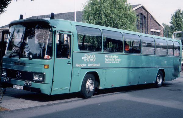Omnibusse im Feuerwehreinsatz sind in Deutschland ja so selten nicht, fast jede größere Feuerwehr besitzt ein solches Fahrzeug, sei es als Einsatzleitung oder als Großraumkrankenwagen. Die damalige Ruhrkohle Westfalen AG, heute DSK, besaß einen MB O 303 15 ÜHE mit dem im Falle eines Grubenünglücks eine Gruppe speziell ausgebildeter Bergleute mit ihrem technischen Gerät zum Unglücksort befördert werden konnte. |
