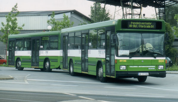 Zwei Jahre später, 2000, machte die Stoag wieder von sich reden, als es ihr gelang für einen Testbetrieb wiederum auf der Trasse ein Anhängergespann zuzulassen, seit Jahrzehnten das Erste im alten Bundesgebiet. Aber woher ein solches Gefährt nehmen, in Deutschland sind Busanhänger seit den 1950er Jahren schließlich nicht mehr im Produktionsprogramm? Richtig, und doch wieder Falsch: Aus der Schweiz! Beim Zugfahrzeug handelt es sich um einen Scania L 94 UB 2700, der Anhänger ist ein Lanz & Marti APM 5.2-13/City. Die Aufbauten für das Gespann fertigte die Firma AS BaltScan aus CKD-Bausätzen der schweizerischen Hess AG. Gebaut für und ausgeliehen vom Verkehrsbetrieb der estnischen Hauptstadt Tallinn sorgte der Einsatz im Ruhrgebiet für ein Umdenken in Sachen Busanhänger: |