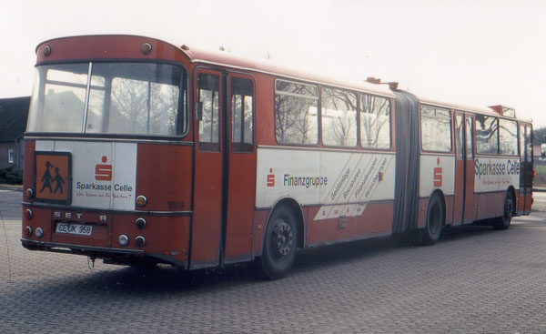 Zum Abschluß mal ein Bus von hinten, doch nicht Irgendeiner! Die Firma Lemke, Koschik und Oberg aus dem Kreis Celle beschaffte seit den 1960er Jahren Gelenkbusse mit der Türanordnung VM-H. Begonnen mit MB O 317 mit Ludewig-Aufbauten endete diese Tradition 1984 mit zwei Setra SG 180 S. |