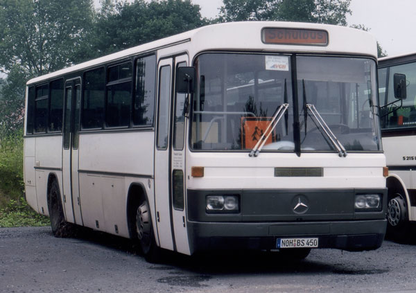 Da hat der Unternehmer seinen Bus mit einem Stern geschmückt, obwohl es noch gar nicht Weihnachten war! Naja, immerhin hat der Steyr SML 256 H12 der Firma Gruber aus Neugnadenfeld an der deutsch-niederländischen Grenze einen Mercedes-Dieselmotor in seinem Heck werkeln. Im Hochsommer 2003 habe ich den Bus in Emlichheim am Bahnhof fotographiert. |