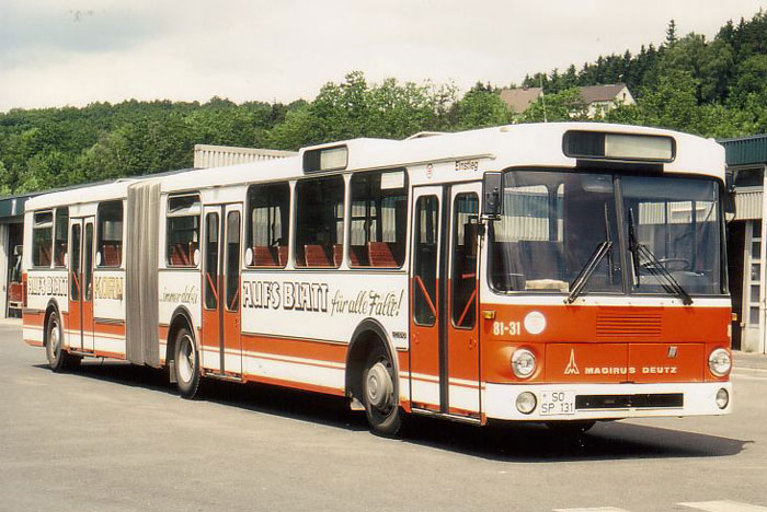 Auch Magirus-Deutz versuchte sich am Gelenkbusbau. Zwischen 1980 und 1982 entstanden 39 Omnibusse des Typs 260 SH 170. Ähnlich dem MAN SG 240 H waren es Heckmotorfahrzege, bei denen der Antrieb nach vorne durch das Gelenk geführt wurde und auf die Mittelachse wirkte. Mit 13 Fahrzeugen war die zur Westfälischen Verkehrsgesellschaft gehörige Regionalverkehr Ruhr-Lippe das Unternehmen mit der größten SH 170-Flotte. |