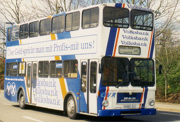 | Die Schnäppchen-Firma Ruoff krönte ihren exotischen Fuhrpark mit zwei Doppeldeckern. Es waren MAN SD 200 mit Doppeldeckaufbauten der Berliner Waggon-Union. Sie waren Musterfahrzeuge für Lieferungen in den fernen Osten. Den örtlichen Gegebenheiten entsprechend, brauchte keine Rücksicht auf niedrige Unterführungen Rücksicht genommen werden und die Fahrzeuge hatten eine Maximalhöhe von 4,40 Metern. Ruoff konnte eine Ausnahmegenehmigung erwirken, die einen Einsatz der überhohen Fahrzeuge auf einer Linie gestattete. Anpassungsarbeiten an den Bussen führte seinerzeit die Fellbacher Firma Vetter durch. | ||