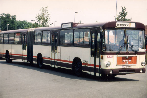 Selbstverständlich nein, aber passen täte es! MAN Standard-Anderthalbdecker mit 220 PS. Die m.E. gelungensten Anderthalbdecker baute Ludewig als Spätwerke 1976 für die Verkehrsbetriebe Minden-Ravensberg. Minden wollte als einziger Verkehrsbetrieb noch nicht auf die Altenessener Großraumbusse verzichten. Geeignete Unterflurmotor-Chassis waren als Serienprodukt im Hause MAN, welches 1972 das Büssing-Erbe übernahm, nicht mehr erhältlich und so kreierte MAN von seinem Gelenkbus-Typ SG 220 eine Abart. Das Konstrukt bekam die Bauartnummer 296 und als Typenbezeichnung SG 220 mit dem Suffix F für Fahrgestell. Es wurde 1976 in fünf und 1978 nochmals in 3 Exemplaren* den Aufbauherstellern zugänglich gemacht. Von den fünf Ludewig Exemplaren waren die KOM 91 und 93 Zweitürer, die KOM 94, 95 und 97 wurden als Dreitürer mit Schaffnersitz an der hinteren Tür geliefert. |