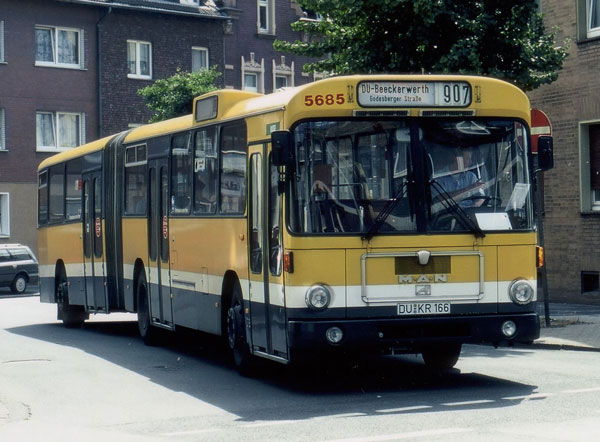 | 1996 verstärkte die Duisburger Verkehrsgesellschaft ihren Fuhrpark mit 15 gebraucht aus Krefeld beschafften Gelenkbussen. Sie alle waren vom Typ MAN SG 220 und entstammten aus verschiedenen Bauserien. Neun Busse des Baujahres 1979 waren in der alten Krefelder Ausführung mit creme-farbenen Lack und der VÖV-Front versehen, die übrigen sechs waren in der neuen Krefelder Lackierung gehalten und besaßen eine Stülb-Front. Mit Baujahr 1983 gehörten sie zu den ganz spät gebauten Vertreten ihres Typs. Da die Krefelder Betriebsnummern prima in das Duisburger System passten, durften sie alle ihre alte Betriebsnummer behalten. Duisburg 5685 war somit der ehemalige KREVAG-Wagen 5685 von 1983. | ||