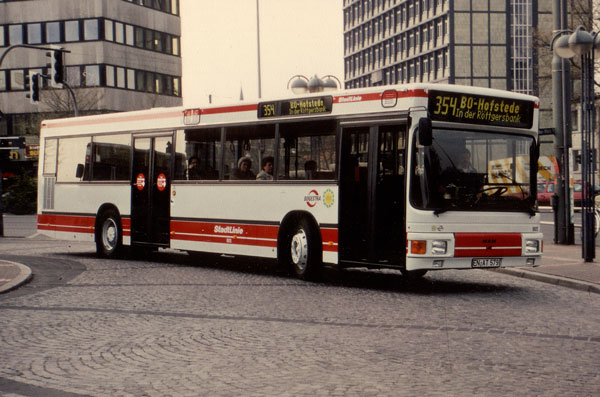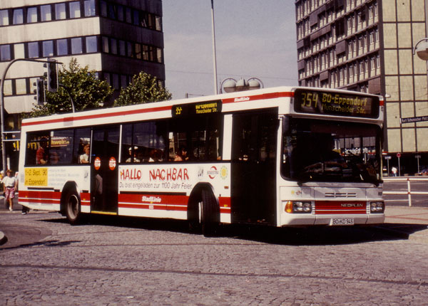 Nachdem im März und April 1989 der Wagen 2099 der BVG Berlin zu Testzwecken bei der Bogestra weilte, entschloß sich das Unternehmen bei der nächsten Busbeschaffung "auf Niederflur" zu setzen und bestellte 23 Wagen des getesteten Typs. Der Berliner Wagen war jedoch ein Dreitürer und hatte im Bereich des Mitteleinstiegs das bei den Vorserienexemplaren übliche "Hundefenster". Die Bogestra hingegen entschied sich bei ihren Wagen für die Ausführung mit Stufe, d.h. im hinteren Innenraum erfolgt der Ausgleich zum höheren Heckbereich durch eine Stufe. Diese Ausführung ist im Vergleich zu der Ausführung mit Rampe sehr selten, so beschafften u.a. Hamburg, Mainz, Nürnberg und Trier diese Version. Der mit einem Hubraum von 6,9 Litern kleinvolumige Motor vom Typ D 0826 LUH leistete 213 PS. Bei den KOM 8901 bis 8912 kam das Renk-Getriebe vom Typ 874AM zum Einbau, die Übrigen erhielten das ZF-Getriebe 5HP500. Obwohl die Busse bereits im Dezember 1989 auf " EN " zugelassen wurden, erfolgte der erste Einsatz im Linieneinsatz am Sonntag, den 4. März 1990. Die Wagen 8901 bis 8912 wurden in Ückendorf, die Wagen 8913 bis 8923 wurden in Weitmar stationiert. Später erhielt auch Witten einige Wagen aus dieser Serie und die allgemeine Ummeldung auf die eigentlichen Standorte machte auch vor diesen Wagen nicht halt. Erste Abgänge aus dieser Serie waren 2004 zu verzeichnen, nach der WM 2006 konnte auch auf letzten verzichtet werden. |