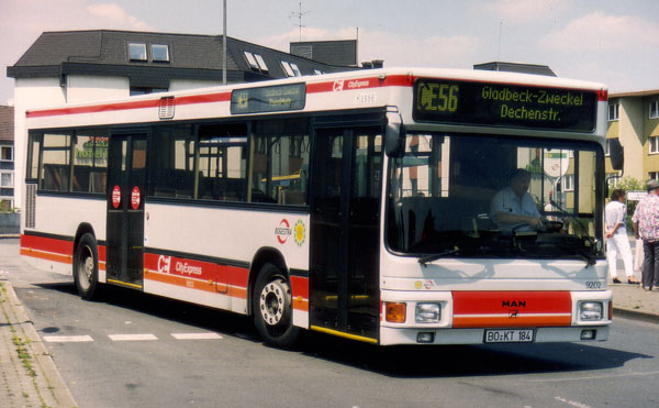Im Januar 1992 erfolgte die Jahreslieferung von 7 weiteren MAN NL 202. Als Getriebe-Lieferant kam wieder ZF mit seinem 5HP500 zum Zuge. In den ersten Einsatzwochen trugen die Busse noch die Betriebsnummern 9101 bis 9107, sie wurden wenig später entpsrechend ihrer Erstzulassung auf 9201 bis 9207 umgenummert. Zum Sommerfahrplanwechsel 1992 wurden zwei Busse dieser Serie, KOM 9201 und 9202, nach Ückendorf umstationiert um fortan auf der CE-Linie 56 ihren Dienst zu verrichten. Für diesen Einsatz bekamen sie die entsprechende Produktlackierung "CityExpress". Nachdem die beiden Ückendorfer auch auf GE -Kennzeichen umgemeldet wurden, schied die Serie im Jahr 2006 aus dem Bogestra-Betriebsbestand. |