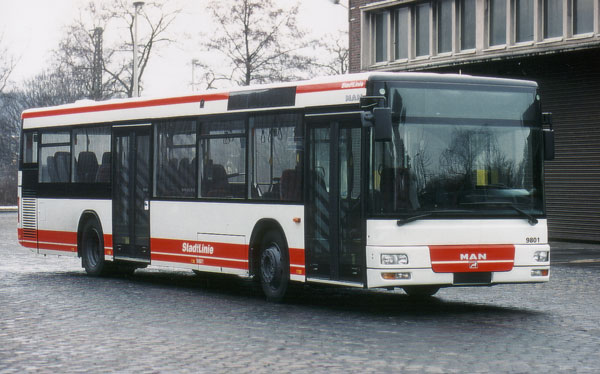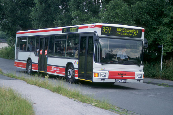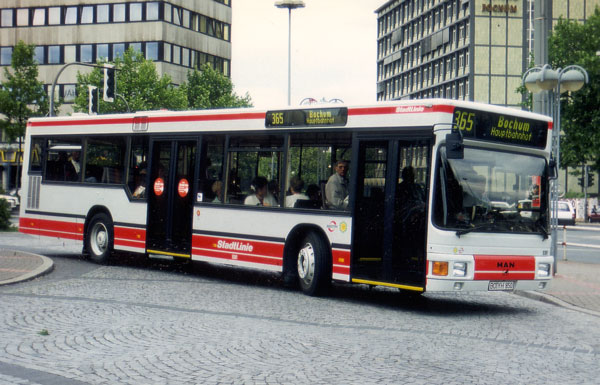 Im April 1993 folgte dann die nächste Lieferung Niederflurbusse. MAN hatte inzwischen seinen NL 202 weiterentwickelt, auf die Podeste auf denen sich beim Vorgängermodell die Sitze im Bereich zwischen erster und zweiter Tür befanden konnte verzichtet werden. Von diesem intern nun als A10 bezeichneten Typ kaufte die Bogestra 16 Exemplare. Antriebstechnisch hatten sie immer noch den selben Motortyp, als getrieb kam wieder das ZF-Getriebe zum Einbau. Obwohl werkseitig noch angeboten, entschied sich die Bogestra gegen die Ausführung mit Stufe und beschaffte die wesentlich "normalere" Ausführung mit Rampe zur Überbrückung des Höhenunterschiedes im hinteren Fahrzeugbereich. Die erste Hälfte der Lieferung wurde Weitmar zugesprochen, die Zweite bekam Ückendorf und selbstverständlich entsprachen ihre Zulassungen den Standorten. Inzwischen wurden einige Wagen zwischen den Höfen getauscht und auch Witten bekam 1997 zwei Busse aus dieser Serie ab. Erste Ausmusterungen fanden im Jahr 2006 statt. |
