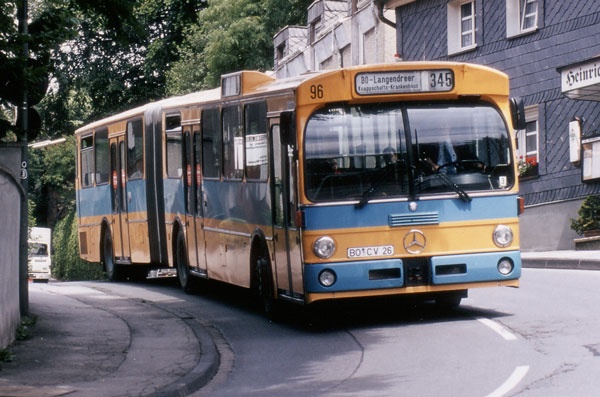 Zeitgleich mit den ersten MAN SG 240 H beschaffte die Bogestra zur Erprobung zwei Schubgelenkbusse vom Typ MB O 305 G. Sie bekamen die Betriebsnummern 86 und 87 im Anschluß an die 84 und 85 benummerten MAN SG 240 H. Als sowohl die Beschaffung weiterer MAN wie auch MB Gelenkwagen feststand wurden sie in 90 und 91 umgenummert um die Typen in geschlossenen Zahlenblocks unterzubringen. Der eingebaute Mercedes-Benz "Oel-Motor" OM 407 hX leistete 240 PS. Zeitgleich mit den ersten MAN SG 240 H erfolgte 1996 die Ausmusterung dieser in Bochum zugelassenen Busse. |