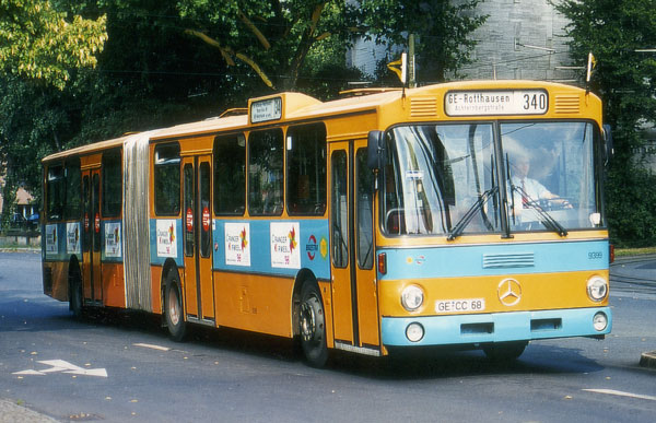 | Die Bewährung der ersten MB O 305 G führte bei der Bogestra dazu, auch in den Folgejahren immer wieder Gelenkbusse dieses Fabrikates zu beschaffen. Im Dezember 1982 folgten daher fünf weitere in Bochum zugelassene O 305 G, die bis 1996 bzw.1997 im Bestand blieben. KOM 94 trug dabei seit 1992 eine Ganzreklame. | ||