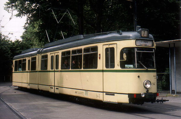 Auf den Spuren der alten Linie 1: Am letzten Tag der Straßenbahn von Essen-Altenessen nach Gelsenkirchen-Horst befährt der Tw 40 noch als "Tw 640" bezeichnet die ehemalige Schleife am Karlsplatz in Essen