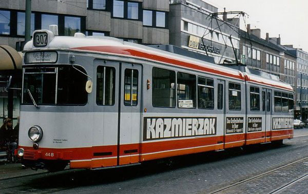 Am Ende ihrer Tage erhielten einige Tw der Serie 33 bis 53 nochmals ein neues Design, diesmal die aktuelle "CityExpress"-Produktfarbe des VRR. Tw 44 steht mit Werbung aus alter Zeit am Bochumer Hauptbahnhof.