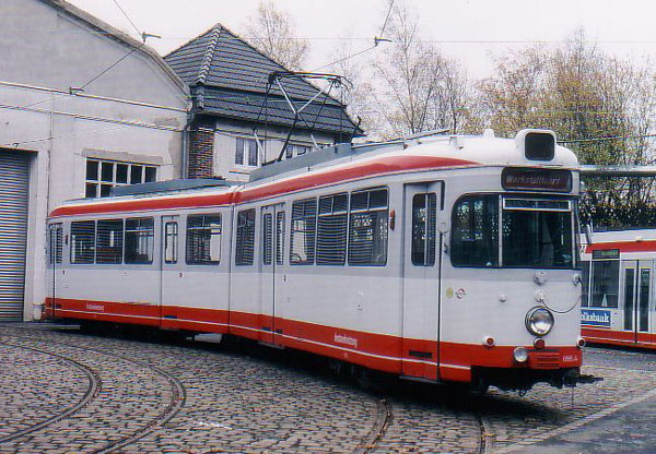 Atw 695 ex Tw 295 im "StadtLinie"-Design als Arbeitsfahrzeug "Instandsetzung" auf dem Gelände der Hauptwerkstatt in Bochum-Gerthe im Jahr 1999
