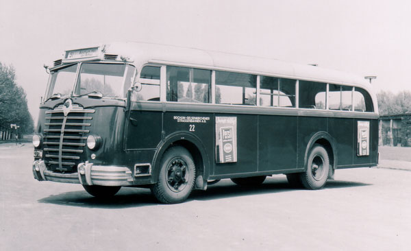 | Nur ganz wenige Busse aus der Vorkriegszeit hatte die Bogestra in den 1950er Jahren in ihrem Bestand. KOM 29, ein Büssing-NAG 250-O mit von Lienen-Aufbau aus dem Jahr 1939, erhielt sogar noch die damals neue Lackierung in dunkelgrün/creme. | ||