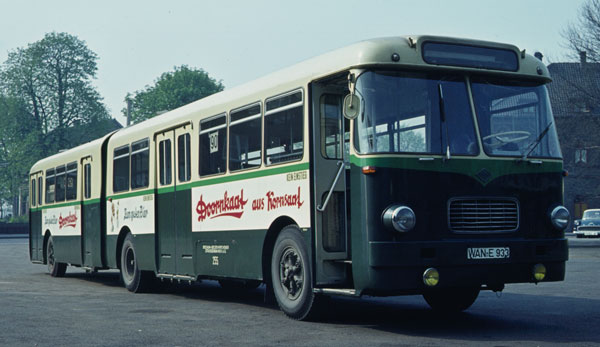Ebenfalls in das Jahr 1960 fällt die erste Beschaffung an Gelenkbussen bei der Bogestra. Die Bogestra hatte im Straßenbahnbetrieb gute Erfahrungen mit den Düwag-Bahnen gemacht und auch die Großraumbusse der Typen Büssing-Uerdingen bzw. Büssing-Düwag 6500 T bewährten sich hervorragend. So waren die Gelenkbusse aus dem Düsseldorfer Hause auch eine gute Wahl! Nach dem Prototyp 251 folgte im selben Jahr die erste Serie. Bis 1967 wurden weitere Serien gekauft. Insgesamt waren es 43 Stück wobei ab 1962 die Typenbezeichnung GBS 165 U11 lautete. Bis Januar 1976 waren die letzten Düwags aus dem Linieneinsatz verschwunden, lediglich KOM 1 aus der letzten Serie wurde 1976 zum Abschleppbus 660 umgebaut, wobei er seinen Nachläufer einbüßte. Bis Anfang der 1980er Jahre war er so im Einsatz. |