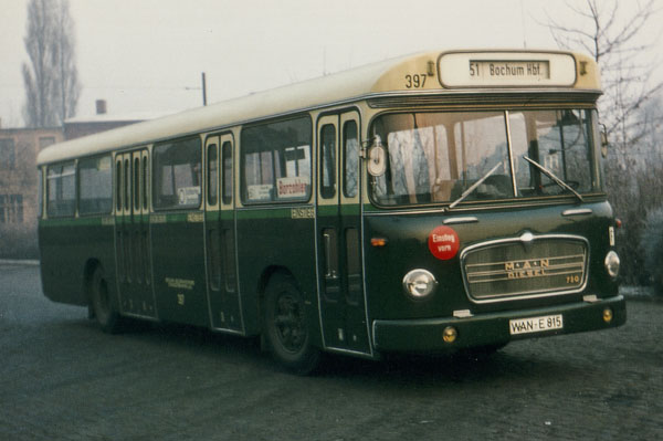 In das Jahr 1963 fiel die erste Beschaffung der für die Bogestra so typischen Dreitürer. Aufgrund ihrer Türanordnung, die es so ausschließlich bei der Bogestra gab, konnten sie sowohl als Einmannwagen als auch als Schaffnerwagen verkehren. Der Schaffner nahm in diesen Fällen über dem rechten Radhaus seinen Platz ein. Diese Dreitürer wurden 1963 auch von Büssing gekauft, es waren 27 Stück Büssing Senator 13. Die MAN Metrobusse vom Typ 750 HO M 11 wurden von 1963 bis 1968 in 74 Exemplaren angeschafft, keiner von ihnen erreichte noch das VRR-Zeitalter. Spätestens 1979 war Schluß mit Linienverkehr, jedoch wurde Bus 394 1976 zum Fahrschulbus 652 umgebaut. Er hielt sich bis 1984. |