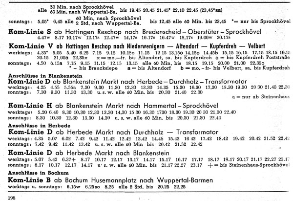 | Am 26. September 1998 wurde der nur wenige Male am Tag verkehrende Abschnitt der Linie 557 zwischen Hasslinghausen Busbahnhof und Durchholzer Platz eingestellt. |