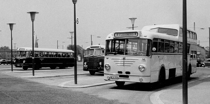 | 1962, 1963 und 1965 folgten die Busse 7603, 7604 und 7605 bis 7606. Die beiden erstgenannten waren auf dem Büssing 13 RU 11-Chassis aufgebaut. Die Busse 7605 und 7606 hießen Büssing Präsident Verbund, wobei das Fahrgestell in Verbundbauweise den vorangegangenen Typen entsprach. Die vier neuesten Anderthalbdecker gingen nach Liquidation des Unternehmens an die Wuppertaler Stadtwerke, die sie unter den Betriebsnummern 1603 bis 1606 in zweiter Besetzung in ihren Bestand einreihte. |